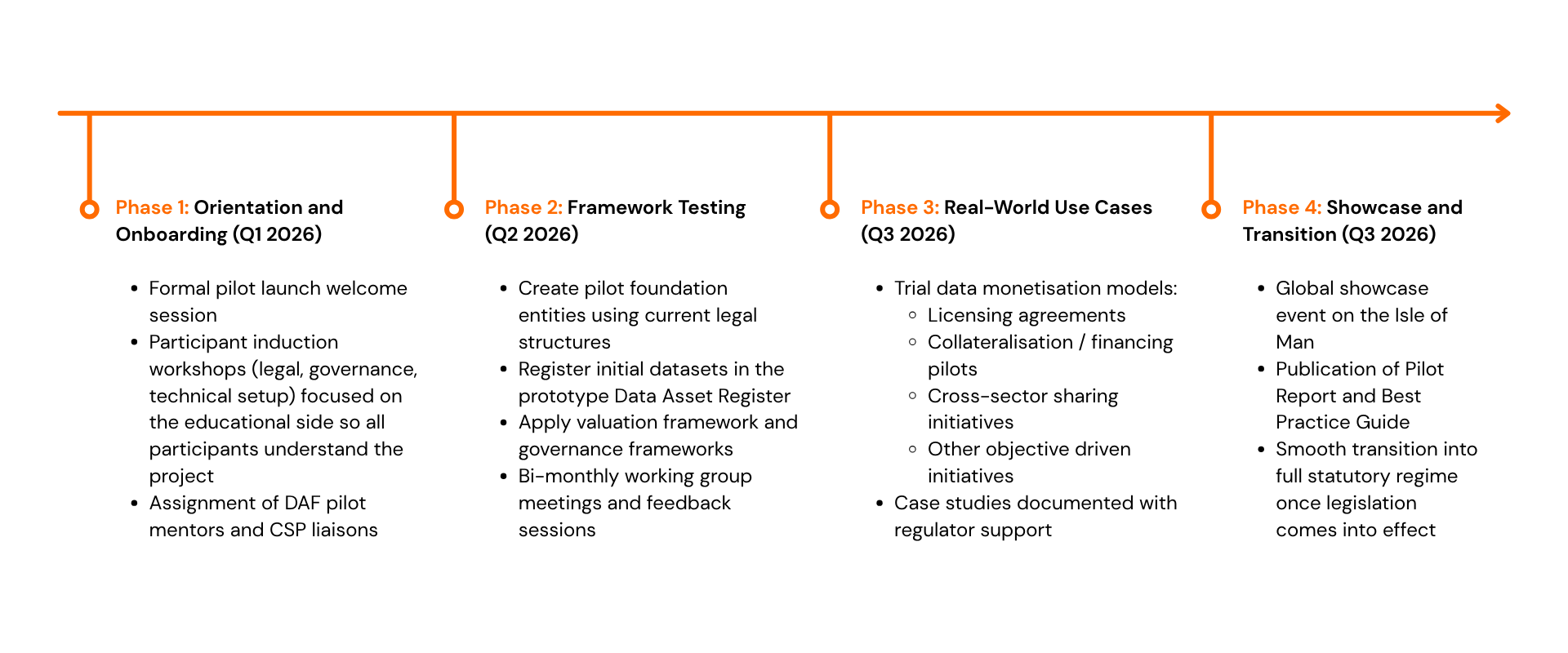 The Pilot is a six-month initiative to test and validate the Data Asset Foundation framework — a statutory subset of the Isle of Man Foundations Act 2011. A Data Asset Foundation is a new type of foundation designed specifically to hold, steward, manage and derive value from data assets.. Participants will together co-develop best practices, trial the legal and technical infrastructure, and demonstrate the commercial value of treating data as an auditable, monetisable, shareable and governable asset. For example, CSPs will help establish and administer the first pilot Data Asset Foundations, providing practical insights to shape the full regime due to launch in 2026; service providers will help with drafting the templates, providing assessments and assurance; and data rich companies will provide the datasets to register and onboard onto the data asset register.
